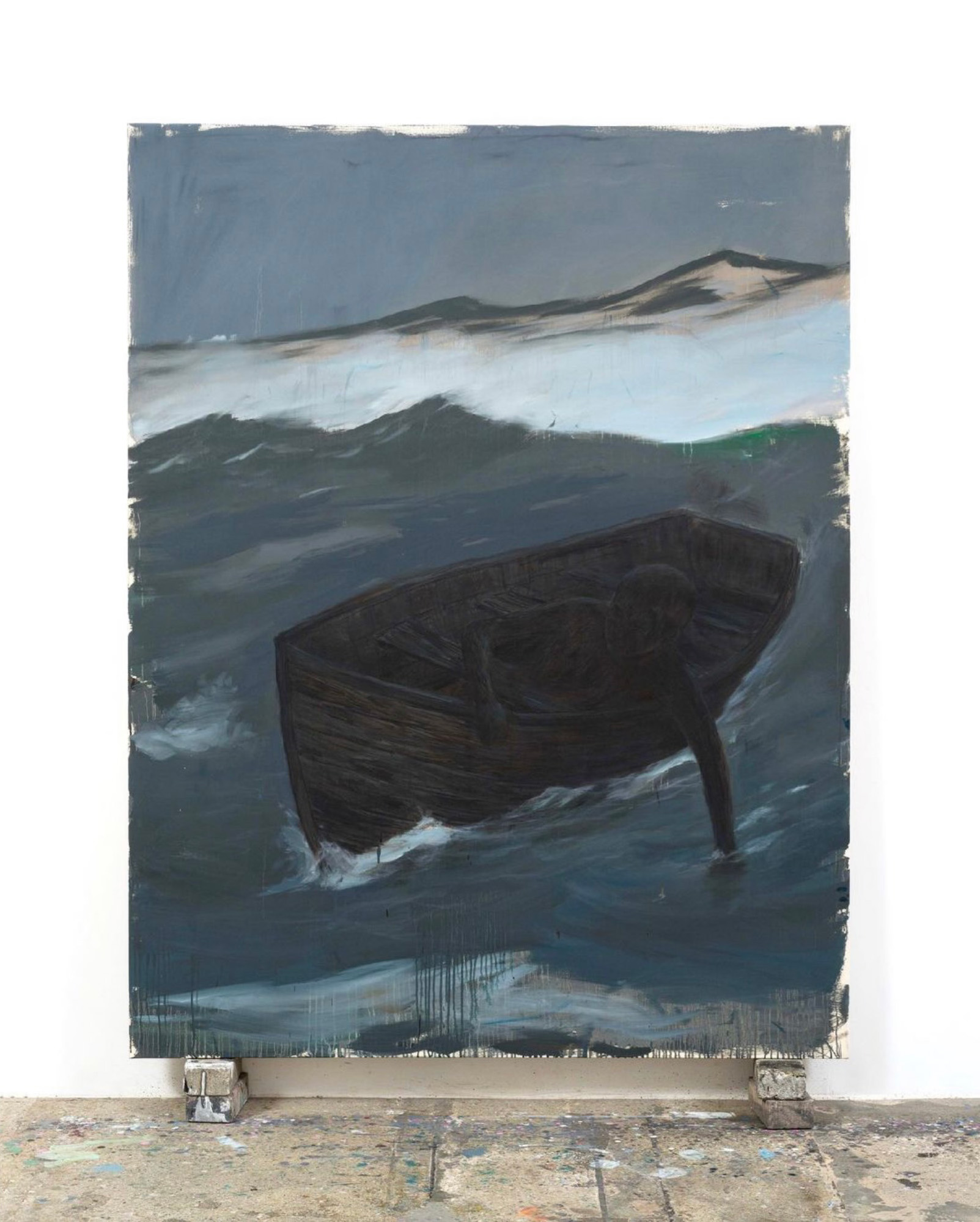 We are left to contend with a moment that is less concerned with how it came about than with its consequences. What the painting offers is an existence in the aftermath—a permanent state of “afterwards.” The battleship, an emblem of conflict, resolve, and violence, has been repurposed as a model, a make-believe, a disarmed weapon, reduced to something toy-like and uncertain. In this sense, it could suggest the vulnerability of something pretending to be more than it is, birthed into a world where reality and fiction are difficult to distinguish. What is really being born in this wood canal between light and dark? I want to say loneliness, but I could also say longing, or dreams—all three are tears of waiting.