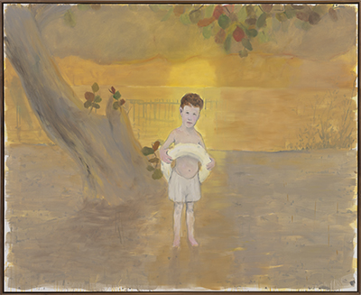 The four paintings present a cycle that begins with hope and ends in catastrophe and redemption, then starts again. The imagery invokes a lush harvest in winter, an orchard in the sky, a burned landscape, and an apple tree against an ominous ocean. The two figures that appear, a handless boy and a falling, burnt man, are both maimed, though in different ways and by different forces. The plane of night descends upon the room, dragging with it an uprooted apple tree—did the plane rip it out of the ground or merely transport it as such? My goal is for the dried-up apple tree to live again with the writings and poems visitors will clip to its branches. These writings will remain secret and, in this way, connect with Carol Frost’s unknown poems.