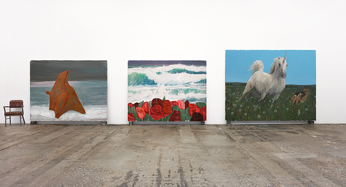 I’m interested in charged fragments with some narrative explosion ticking inside them, but not in storytelling or ready-made myths, because I don’t think they have much to do with the power of a work of art. So, I don’t like to talk too much about images, which is always the easy place to go for representational work. However, it seems worth mentioning that for this exhibition, I’ve worked with interiors and the idea of the artist, which are not typical in my work. Houses, buildings, stairs, partly open doors at the cusp of an event. For the first time, I’ve been concerned with painting the artist, a reflexive gesture that attends to the one who gives attention, which in our day-to-day efforts amounts to desperately trying to use the fleeting time life offers to grasp the ungraspable. Maybe the most consequential aspect of the artist’s work is the effort to find significance amid impermanence.